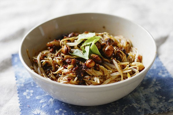 5、捞起花椒和干辣椒,将油泼在蒜粒上,再倒上适量的醋