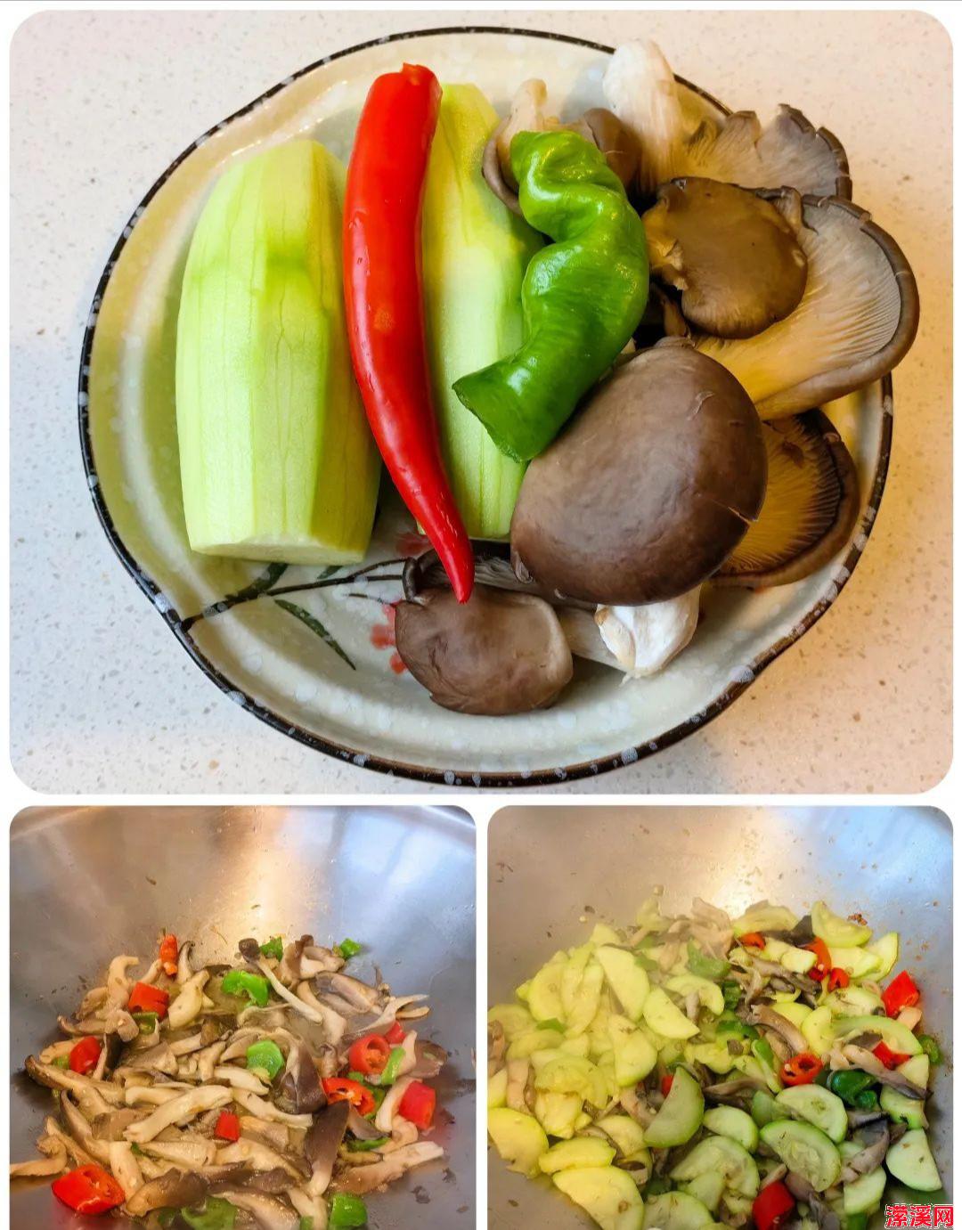 ①食材洗净,平菇撕成小条,西葫芦切片,辣椒切丁备用。