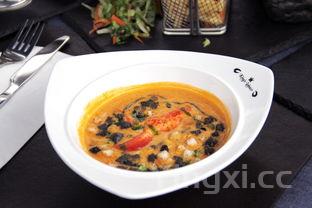 泰式冬阴功汤 材料:泰国味露8克,泰国青柠檬汁15克,泰国辣椒膏20克,白糖8克,鸡粉6克,香配料(草菇30克,小番茄10克,南姜片5克,柠檬叶2克,三花淡奶40克,香茅梗10克,香茅草10克,小辣椒10克,高汤500克),香菜2克。做法:鲜虾去头和虾线后治净;文蛤治净备用;南姜切成小片。